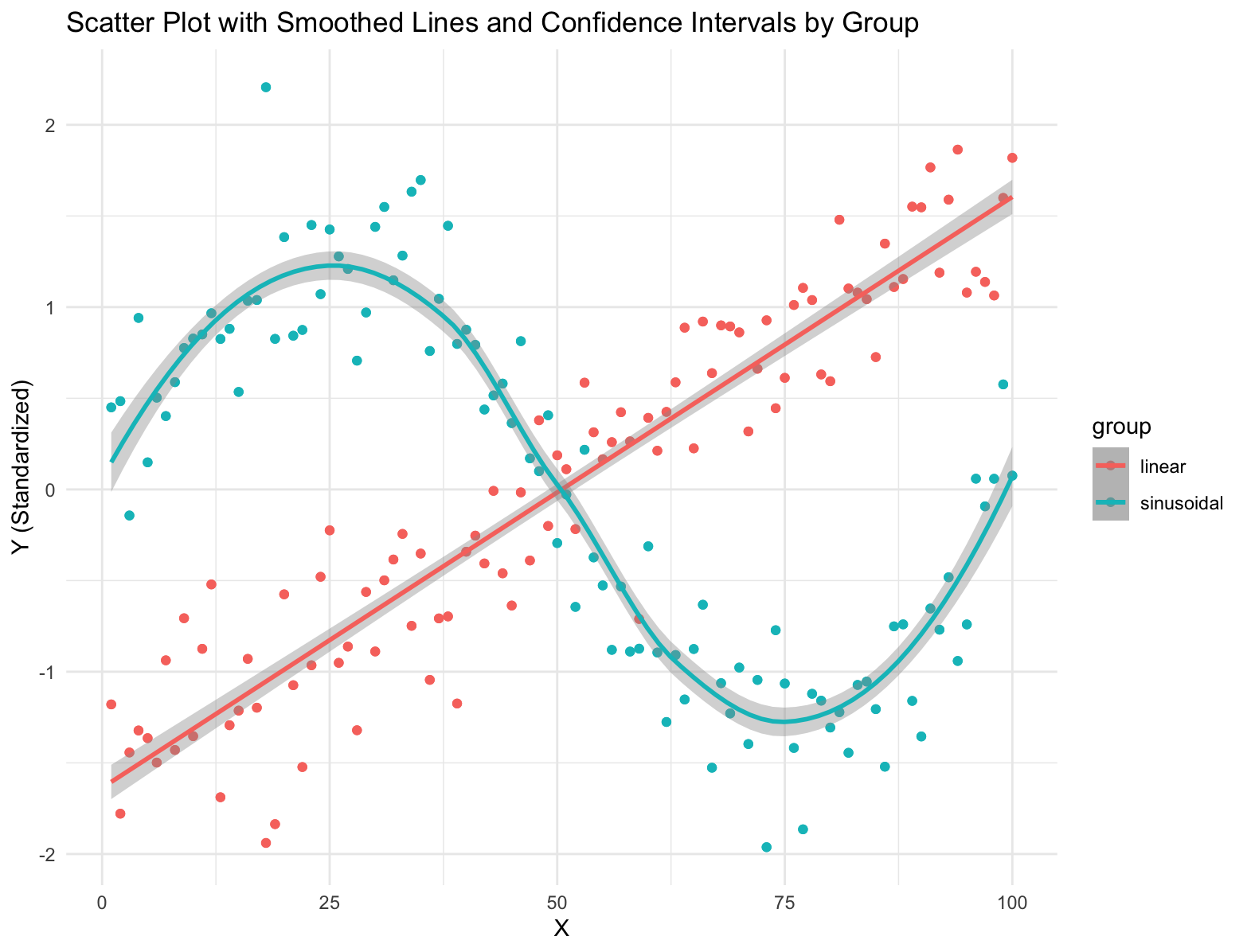 labs(title = "Scatter Plot with Smoothed Lines and Confidence Intervals by Group", x = "X", y = "Y (Standardized)") +