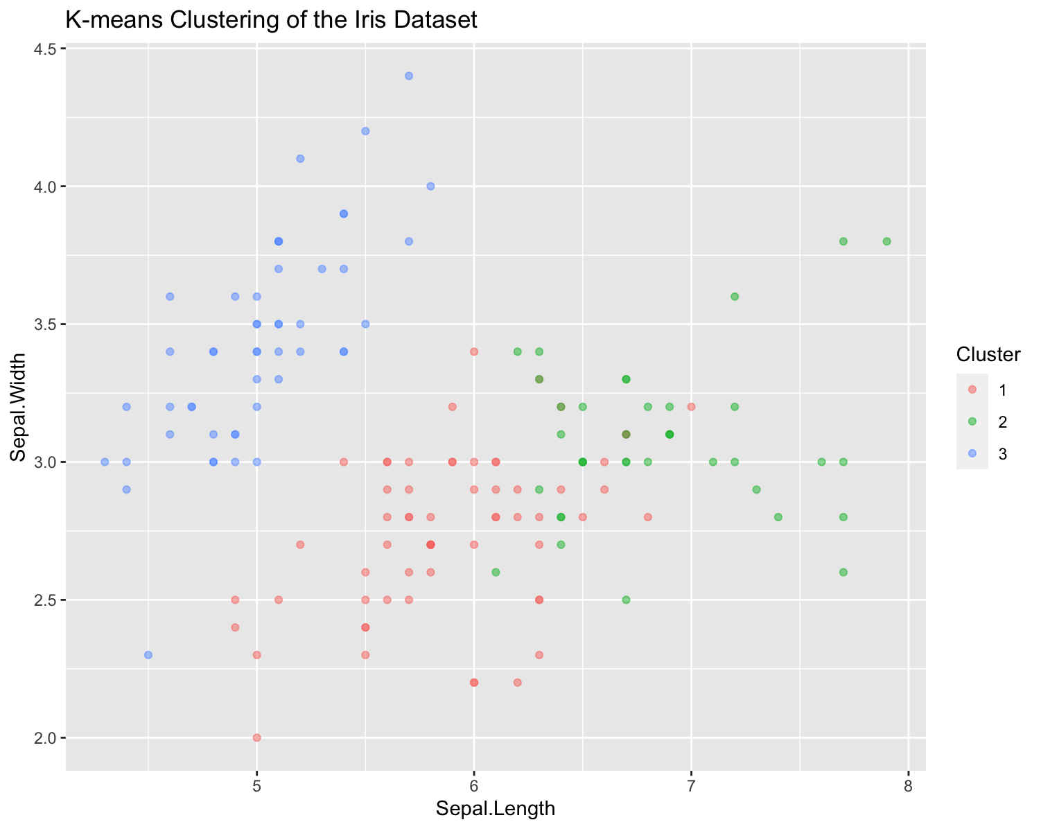 ggplot(iris, aes(Sepal.Length, Sepal.Width, color = factor(kmeans_result$cluster))) +