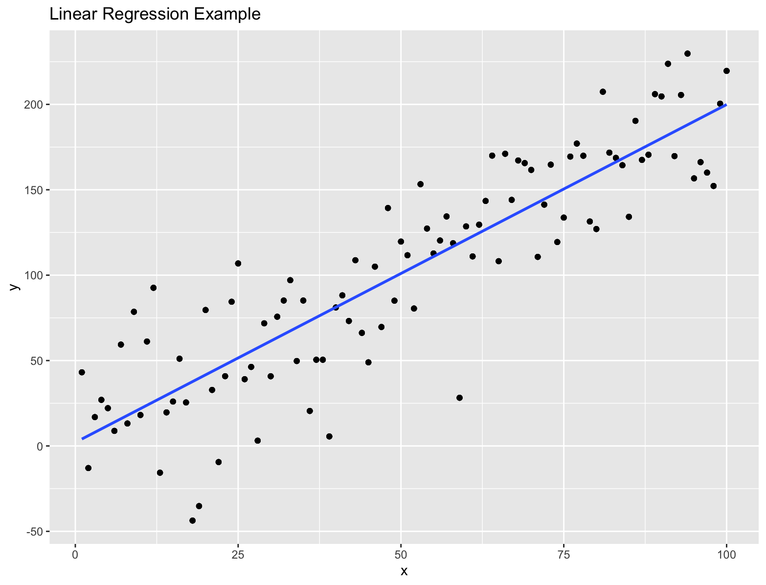 labs(title = "Linear Regression Example", x = "x", y = "y")