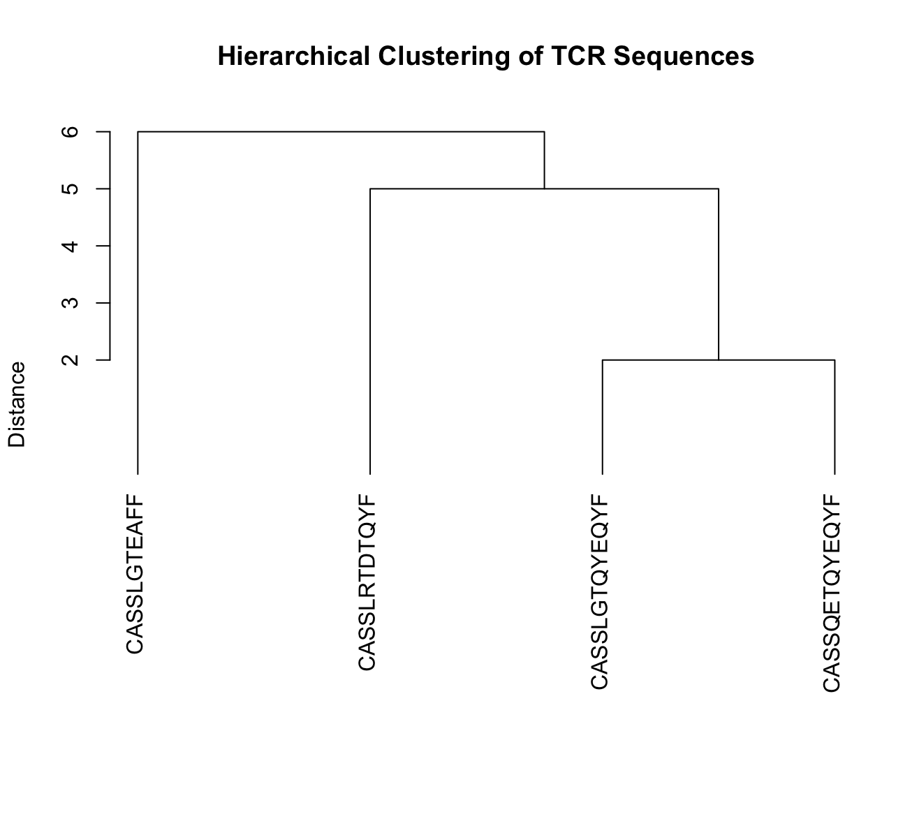 labels = names(tcr_sequences), hang = -1) # Ensure labels hang below the plot