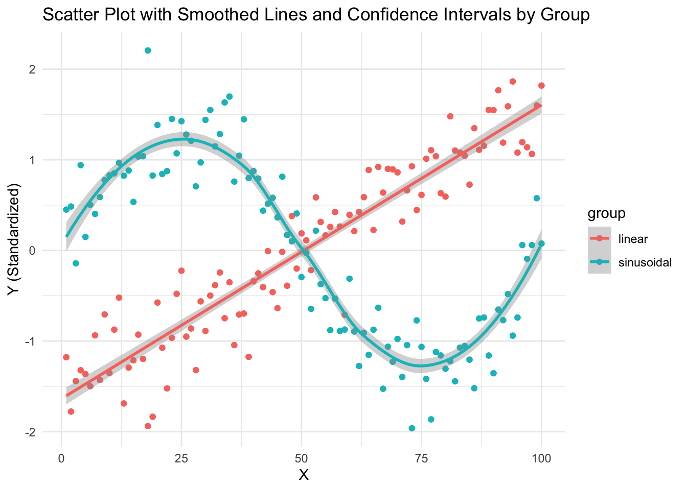 labs(title = "Scatter Plot with Smoothed Lines and Confidence Intervals by Group", x = "X", y = "Y (Standardized)") +