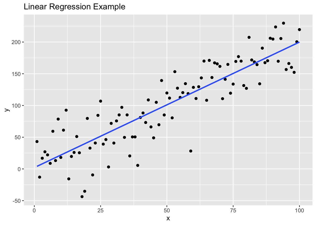 labs(title = "Linear Regression Example", x = "x", y = "y")
