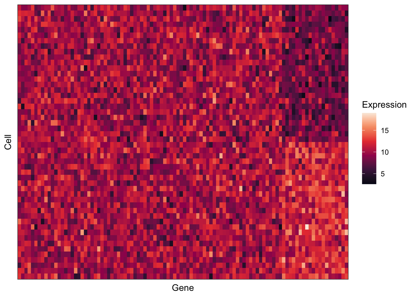 gene_expression[81:100, 26:50] <- gene_expression[81:100, 26:50] - 2 # Cancer cells