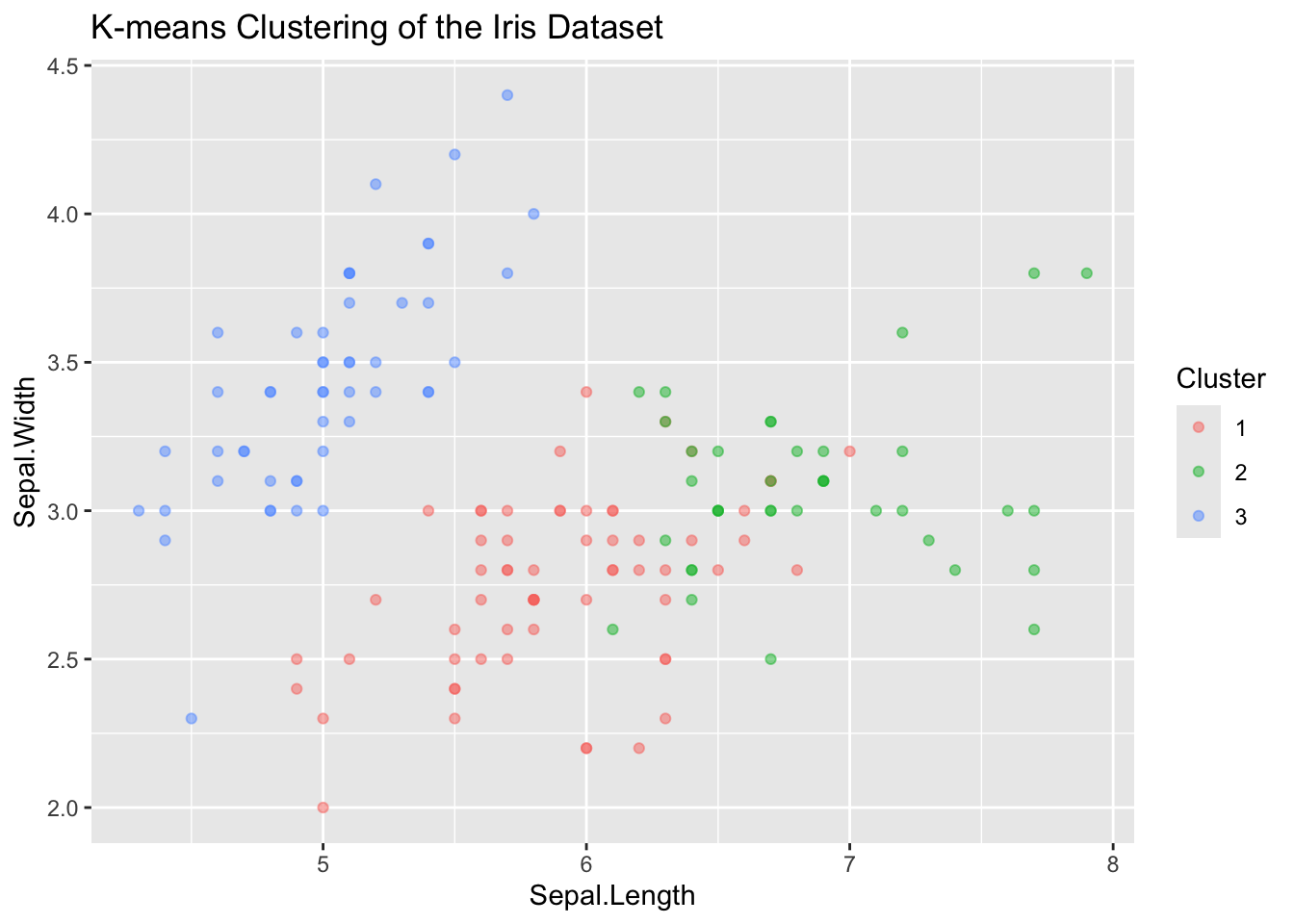 ggplot(iris, aes(Sepal.Length, Sepal.Width, color = factor(kmeans_result$cluster))) +