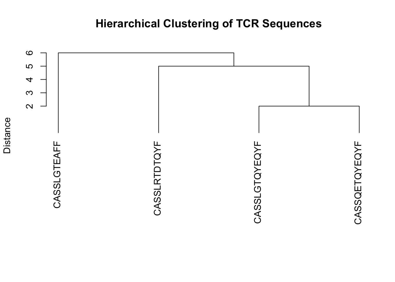 main = "Hierarchical Clustering of TCR Sequences", sub = "", xlab = "", ylab = "Distance",