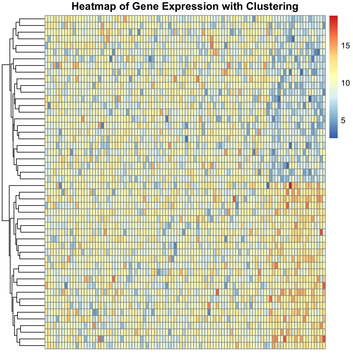We can create a more complex simulated dataset of simulated single cell gene expression data. In this case, we have two cell types, and expect that the resulting dendrogram produced from the clustering should show clear differences between these cell types. Finally, we can plot the expression values in heatmap to visualize the difference between the genes across cells. The ordering of the rows is dictated by the dendrogram, drawing more similar cells closer together, allowing us to see the expression patterns that define each cell type.