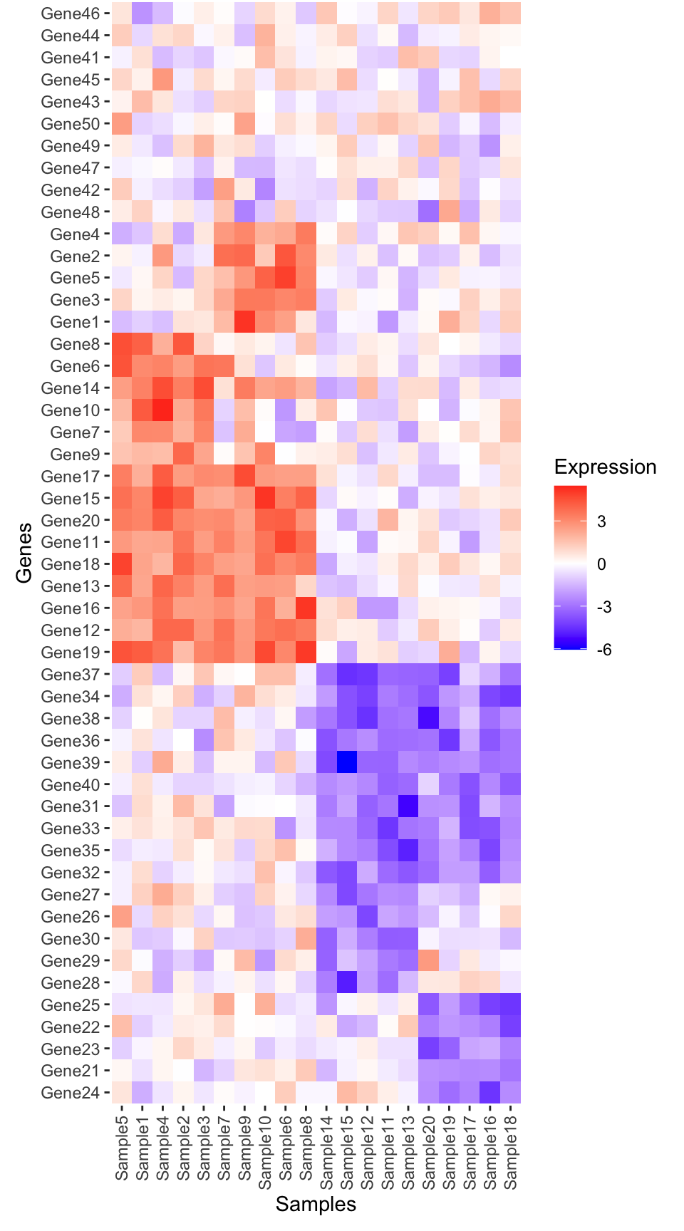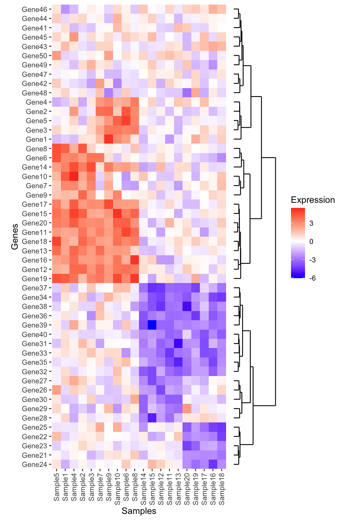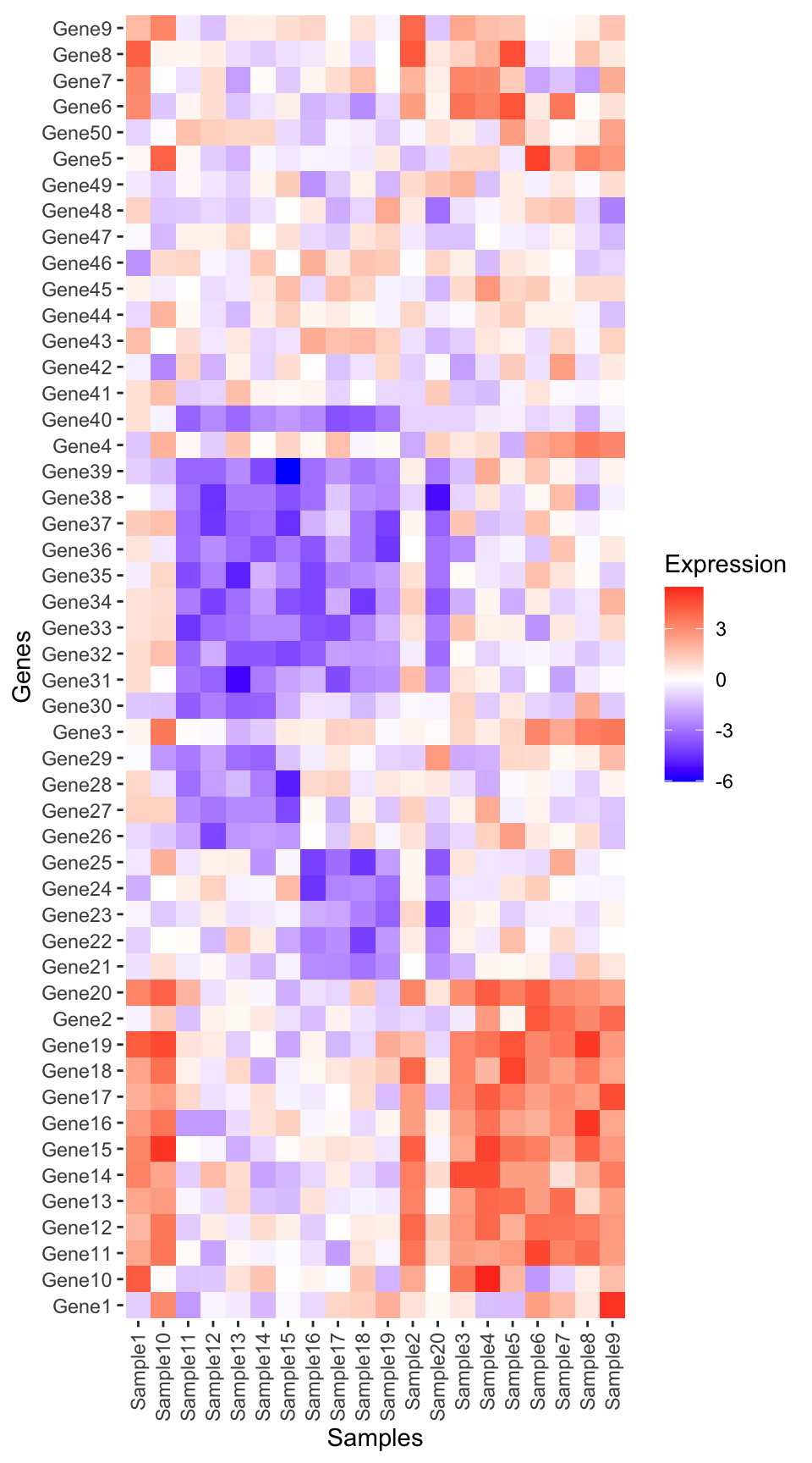 # Plot heatmap using ggplot2heatmap_plot<-ggplot(expression_long, aes(x =fct_relevel(Sample, ordered_samples), y =fct_relevel(Gene, ordered_genes), fill =Expression))+geom_tile()+scale_fill_gradient2(low ="blue", high ="red", mid ="white", midpoint =0)+labs(title =NULL, x ="Samples", y ="Genes")+guides(x =guide_axis(angle =90))+theme( axis.line =element_blank(), panel.background =element_blank(), plot.margin =margin(t =0, r =3, b =3, l =3, unit ="mm"))heatmap_plot