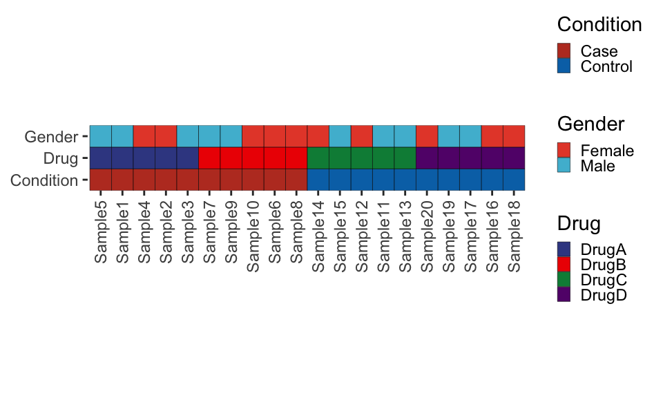 library(ggnewscale)library(ggsci)# Options for legend width and heightsguide_kwd<-0.5guide_kht<-0.5# Create metadata plotmetadata_plot<-ggplot(metadata, aes(x =fct_relevel(Sample, ordered_samples)))+geom_tile(aes(y ="Condition", fill =Condition), color ="black")+# Here we tell the order of the legendsscale_fill_nejm(guide =guide_legend( order =1, keywidth =guide_kwd, keyheight =guide_kht))+ggnewscale::new_scale_fill()+geom_tile(aes(y ="Drug", fill =Drug), color ="black")+scale_fill_aaas(guide =guide_legend( order =2, keywidth =guide_kwd, keyheight =guide_kht))+ggnewscale::new_scale_fill()+geom_tile(aes(y ="Gender", fill =Gender), color ="black")+scale_fill_npg(guide =guide_legend( order =2, keywidth =guide_kwd, keyheight =guide_kht))+# Limits set the order of the main panelscale_y_discrete( limits =c("Condition", "Drug", "Gender"), expand =c(0, 0))+# Adjust theme elements to remove redundant text etctheme( axis.line =element_blank(), panel.background =element_blank(), legend.position ="right")+labs(x =NULL, y =NULL)+guides(x =guide_axis(angle =90))metadata_plot+coord_fixed()# We add coord fixed just to fit with legend