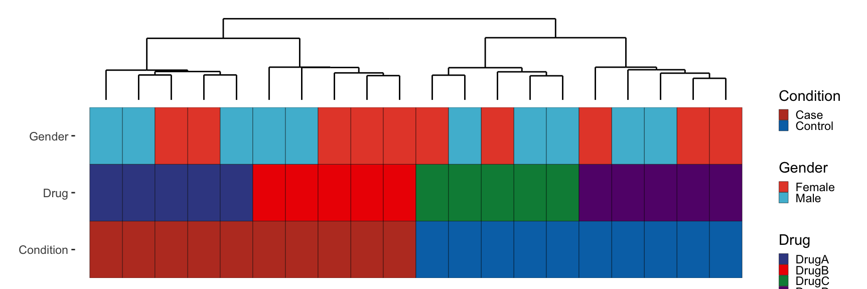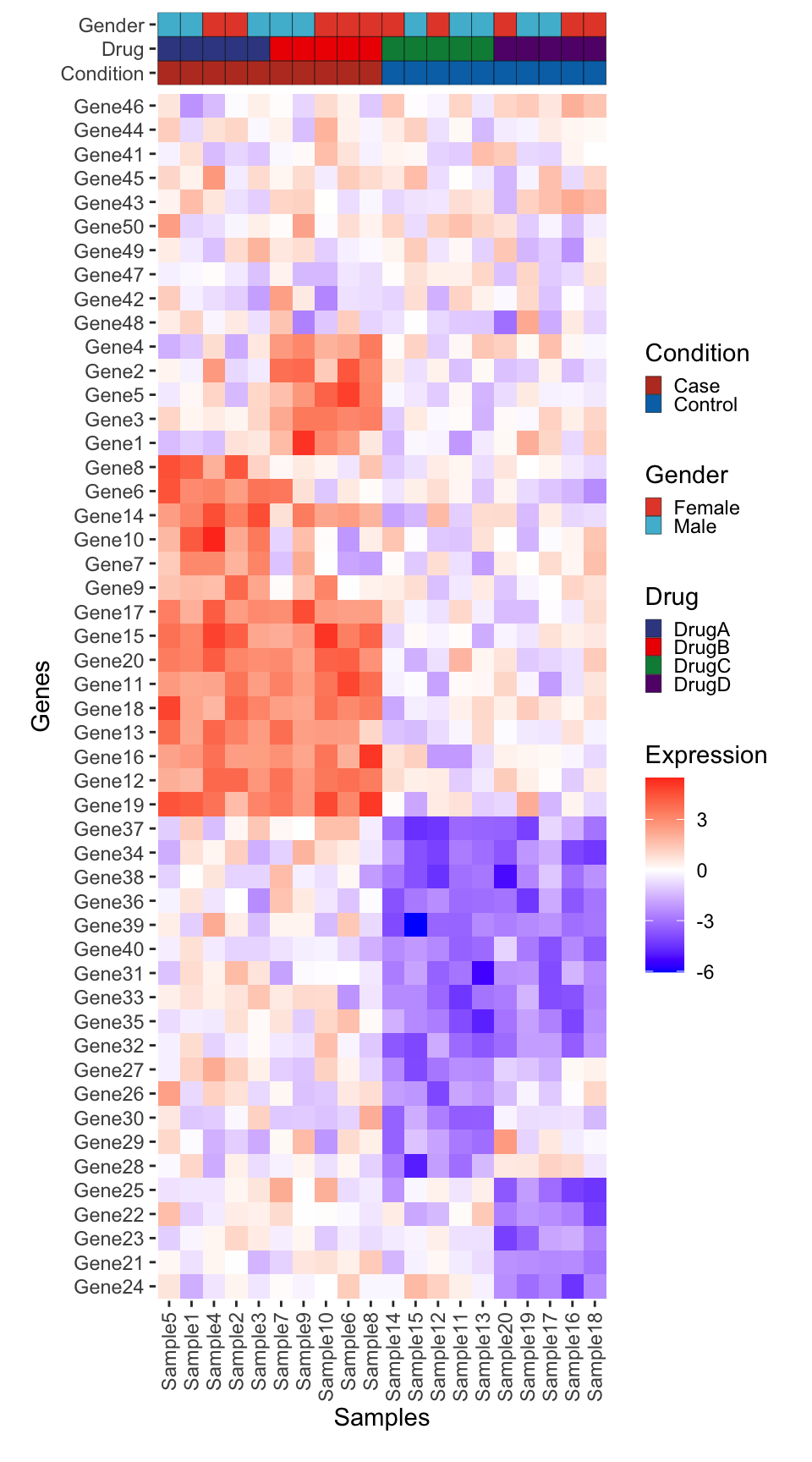 # Load necessary librarieslibrary(tidyverse)library(patchwork)# Set seed for reproducibilityset.seed(3)# Generate gene expression datagenes<-paste0("Gene", 1:50)samples<-paste0("Sample", 1:20)expression_data<-matrix(rnorm(50*20), nrow =50, dimnames =list(genes, samples))# Introduce differential expression for case vs controlidx_case_genes<-1:20idx_conrol_genes<-21:40idx_case_samples<-1:10idx_control_samples<-11:20expression_data[idx_case_genes, idx_case_samples]<-expression_data[idx_case_genes, idx_case_samples]+3expression_data[idx_conrol_genes, idx_control_samples]<-expression_data[idx_conrol_genes, idx_control_samples]-3# Some drug specific effectsexpression_data[1:5, 1:5]<-expression_data[1:5, 1:5]-3expression_data[6:10, 6:10]<-expression_data[6:10, 6:10]-3expression_data[21:25, 11:15]<-expression_data[21:25, 11:15]+3expression_data[26:30, 16:20]<-expression_data[26:30, 16:20]+3# Create some metadatametadata<-data.frame( Sample =samples, Condition =rep(c("Case", "Control"), each =10), Gender =rep(c("Male", "Female"), times =10), Drug =c(rep("DrugA", 5), rep("DrugB", 5), rep("DrugC", 5), rep("DrugD", 5)))