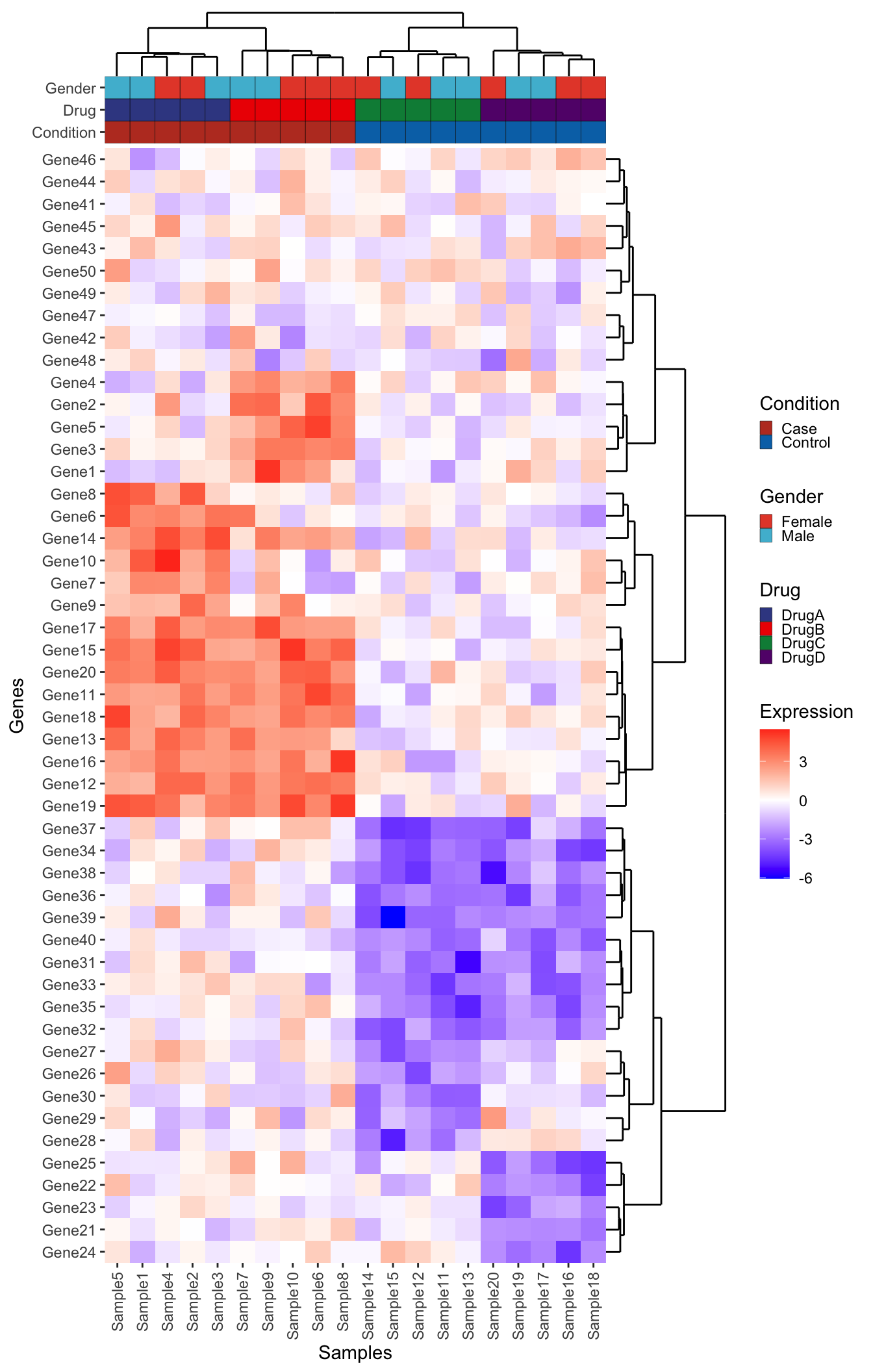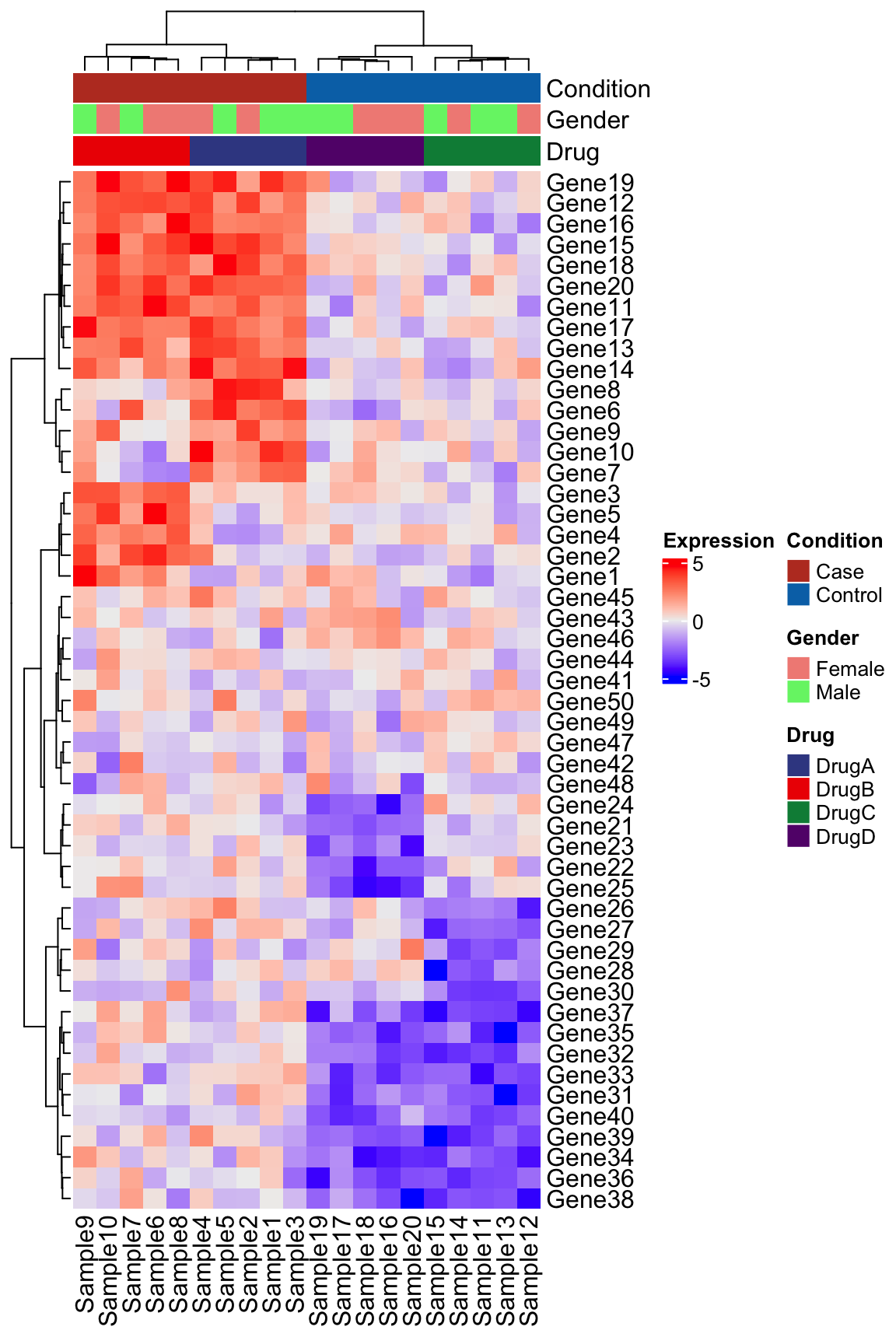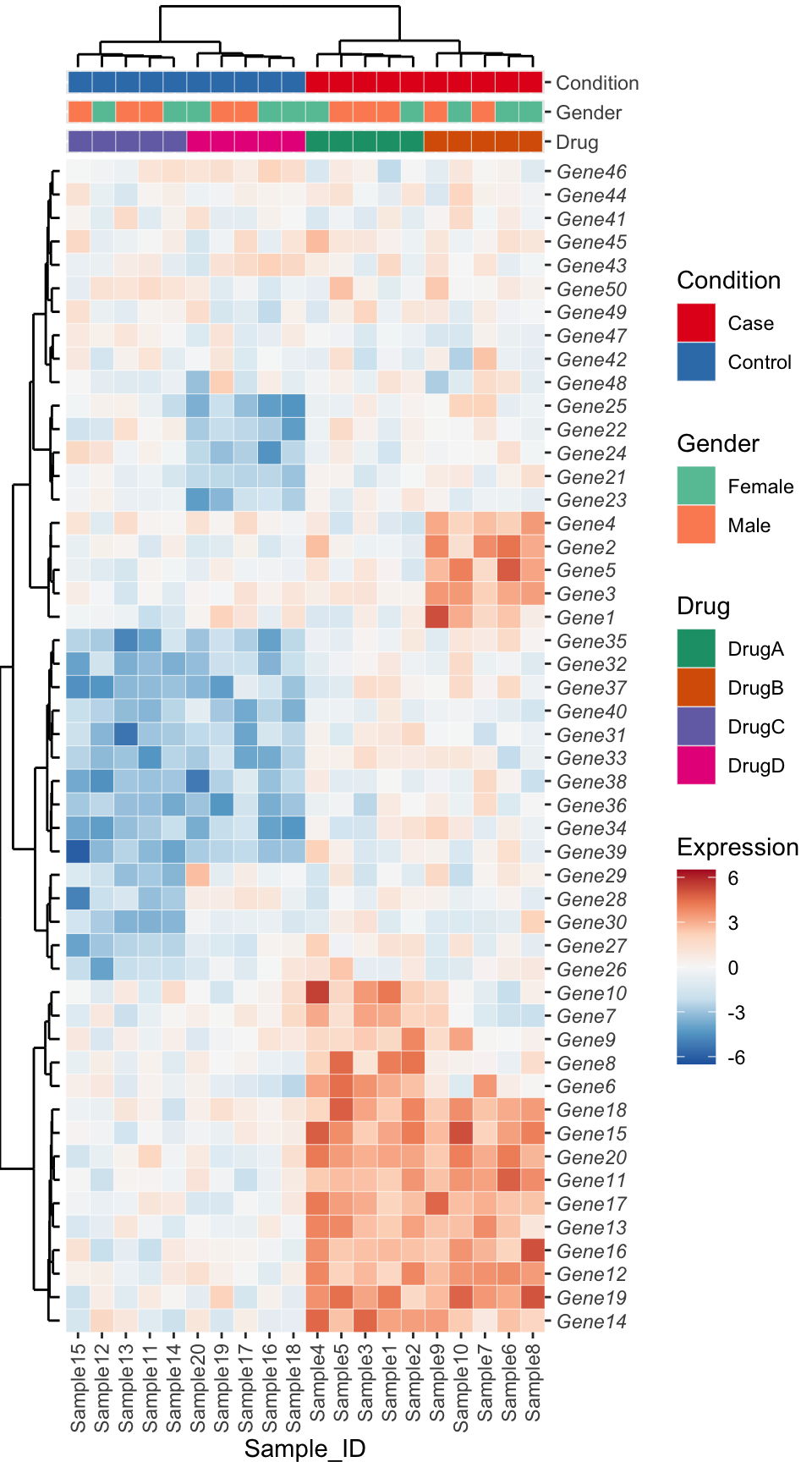 # Expects sample names in rowsmeta_ht<-metadata%>%column_to_rownames("Sample")# Set up the colorsmeta_cols<-list("Condition"=c("Case"="#BC3C29FF","Control"="#0072B5FF"),"Drug"=c("DrugA"="#3B4992FF","DrugB"="#EE0000FF","DrugC"="#008B45FF","DrugD"="#631879FF"),"Sex"=c("Male"="#E64B35FF","Female"="#4DBBD5FF"))top_anno<-HeatmapAnnotation( df =meta_ht, col =meta_cols)Heatmap( matrix =expression_data, name ="Expression", clustering_method_columns ="ward.D2", clustering_method_rows ="ward.D2", top_annotation =top_anno)