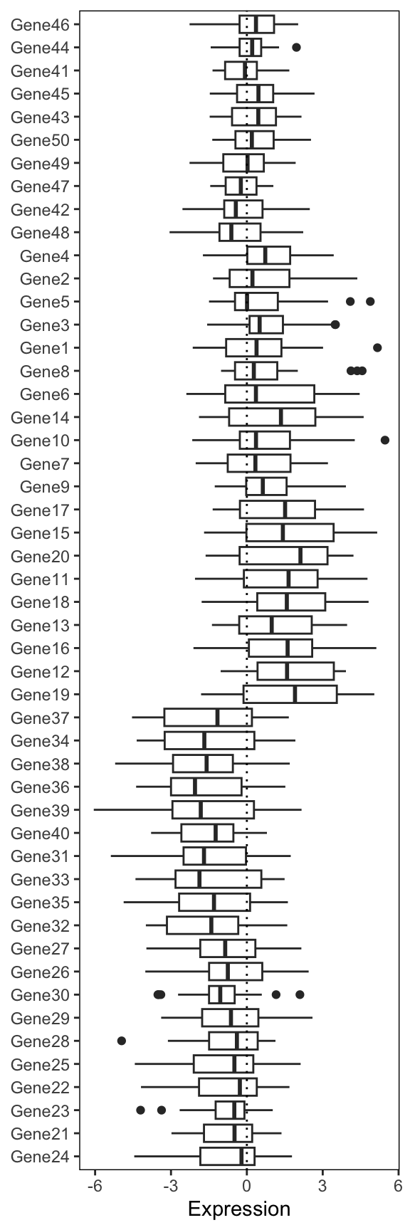 First create the boxplot using the long form expression data. Note that because the boxplot is going to be horizontal, the x-axis represents the numeric expression values, while the y-axis represents the individual genes. Also, don’t forget to reorder the genes