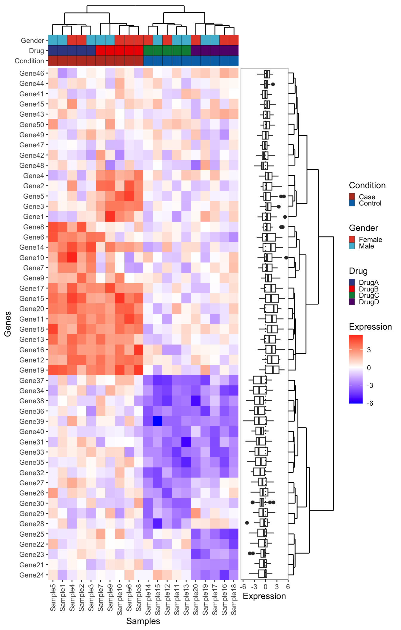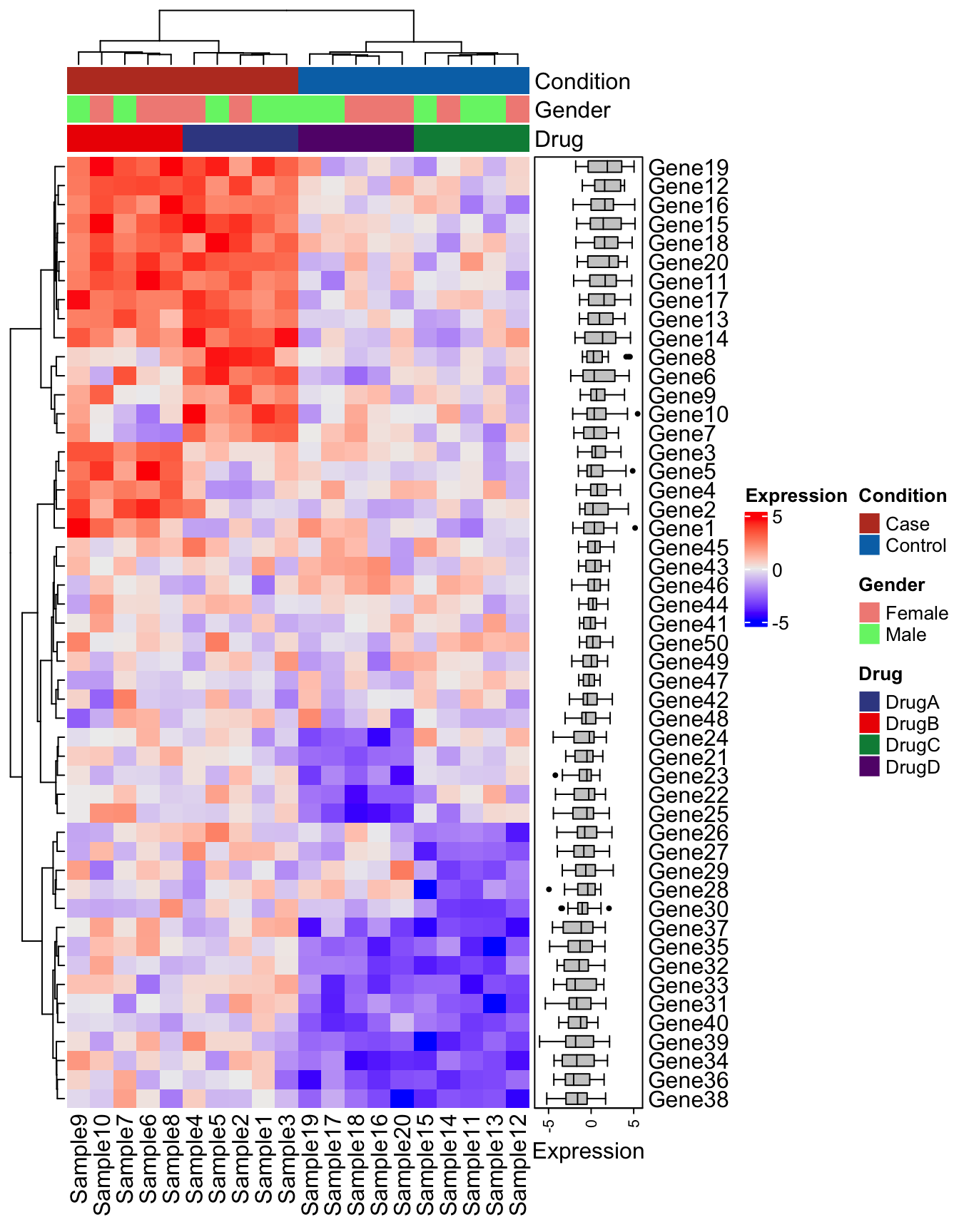 right_anno<-HeatmapAnnotation(Expression =anno_boxplot(expression_data), which ="row")Heatmap( matrix =expression_data, name ="Expression", clustering_method_columns ="ward.D2", clustering_method_rows ="ward.D2", top_annotation =top_anno, right_annotation =right_anno)