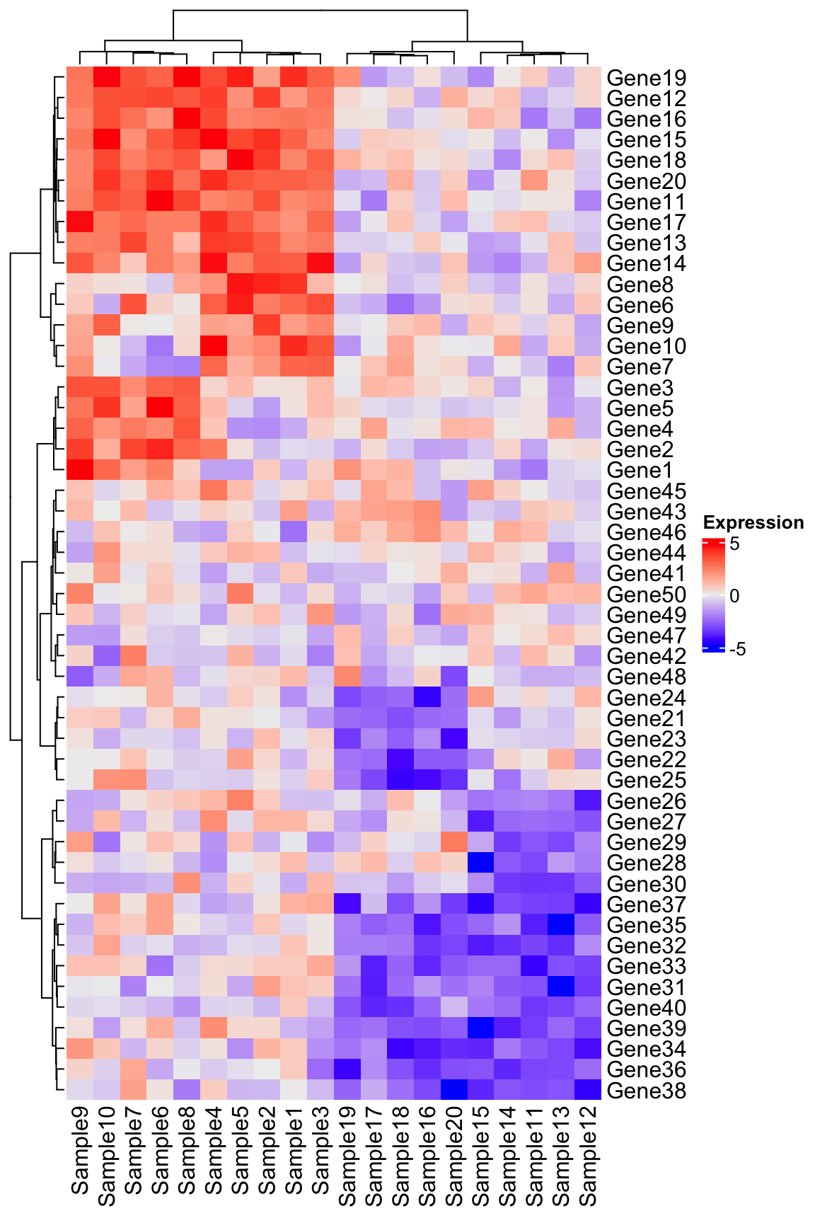 library(ComplexHeatmap)# Note that ComplexHeatmap uses the matrix directlyHeatmap( matrix =expression_data, name ="Expression", clustering_method_columns ="ward.D2", clustering_method_rows ="ward.D2")