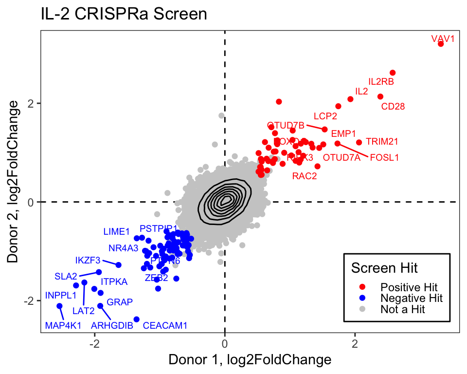 library(tidyverse)library(readxl)library(ggrepel)log2_df<-read_excel("data/science.abj4008_table_s2.xlsx")# Always good practice to check the data to ensure it was loaded correctly:# head(log2_df)# The plot only contains the IL2 results from CRISPRa screens,# so we will filter downlog2_df_filter<-log2_df%>%filter(Cytokine=="IL2", CRISPRa_or_i=="CRISPRa")# Select genes that we want to label based on top LFCngenes_label<-16label_genes<-log2_df_filter%>%filter(Screen_Version=="Primary")%>%# For ease only use primary donorgroup_by(sign(LFC))%>%# Group by the sign (pos or neg) lfcarrange(desc(abs(LFC)))%>%# Sort by descending absolute lfc valuesslice_head(n =ngenes_label)%>%# Take the top n genespull(Gene)# Pull these out from the data frame# We need to pivot the Screen_Version variable (which is equivalent to Donor1 and Donor 2) into separate columnslog2_df_filter_wide<-log2_df_filter%>%pivot_wider(id_cols =c("Gene", "Hit_Type"), names_from ="Screen_Version", values_from ="LFC")%>%filter(!is.na(Primary), !is.na(CD4_Supplement))# Reorder the factor so that we can plot the hits on toplog2_df_filter_wide$Hit_Type<-factor(log2_df_filter_wide$Hit_Type, levels =c("Positive Hit", "Negative Hit", "NA"), labels =c("Positive Hit", "Negative Hit", "Not a Hit"))# Now we can plot:final_plot<-log2_df_filter_wide%>%# This will order by the factor so the hits are plotted on toparrange(desc(Hit_Type))%>%ggplot(aes(x =Primary, y =CD4_Supplement))+geom_hline(yintercept =0, linetype ="dashed")+geom_vline(xintercept =0, linetype ="dashed")+geom_point(aes(color =Hit_Type))+stat_density_2d(color ="black")+# For this geom text, we filter the original data to only include# genes that we want labeled from the above filteringgeom_text_repel( data =filter(log2_df_filter_wide, Gene%in%label_genes),aes(label =Gene, colour =Hit_Type), size =0.36*7, show.legend =F, max.overlaps =Inf)+scale_colour_manual(values =c("Positive Hit"="red", "Not a Hit"="grey80", "Negative Hit"="blue"))+theme_bw()+theme( panel.grid =element_blank(),# Place legend inside the plot legend.position =c(0.85, 0.15),# Change vertical spacing between legend items legend.key.height =unit(3, "mm"),# Place a box around the legend legend.background =element_rect(fill =NA, color ="black"))+labs( x ="Donor 1, log2FoldChange", y ="Donor 2, log2FoldChange", title ="IL-2 CRISPRa Screen", color ="Screen Hit")# We can save our plot if desired# ggsave(final_plot, file = "my_pretty_plot.pdf", width = 5, height = 4)# And now view itfinal_plot